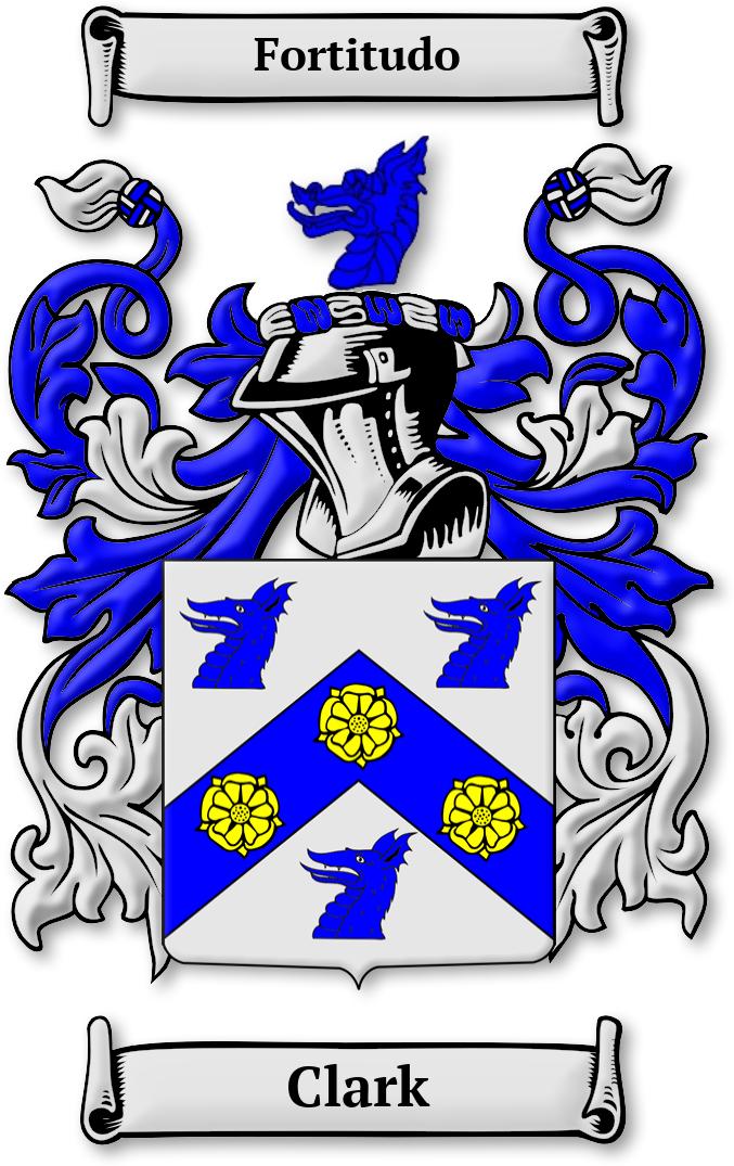 The English surname Clark was first found in Northumberland, where the ancestral home of the Clark family is thought to be located. The surname comes from one in the family having worked as a scholar, a person serving under religious orders, or as a secretary. The surname originally derived from the Latin form clericus. The name may have been Norman in origin, having descended from the name Le Clerc. The family was first found in Hampshire where Richerius clericus was listed in the Domesday Book of 1086 and in early rolls in both Normandy and England. The Family Motto is "Fortitudo" (translated: "Fortitude"). The Coat of Arms is a silver shield with a chevron between three dragons' heads, and three roses on the chevron, and the Crest is a dragon's head.