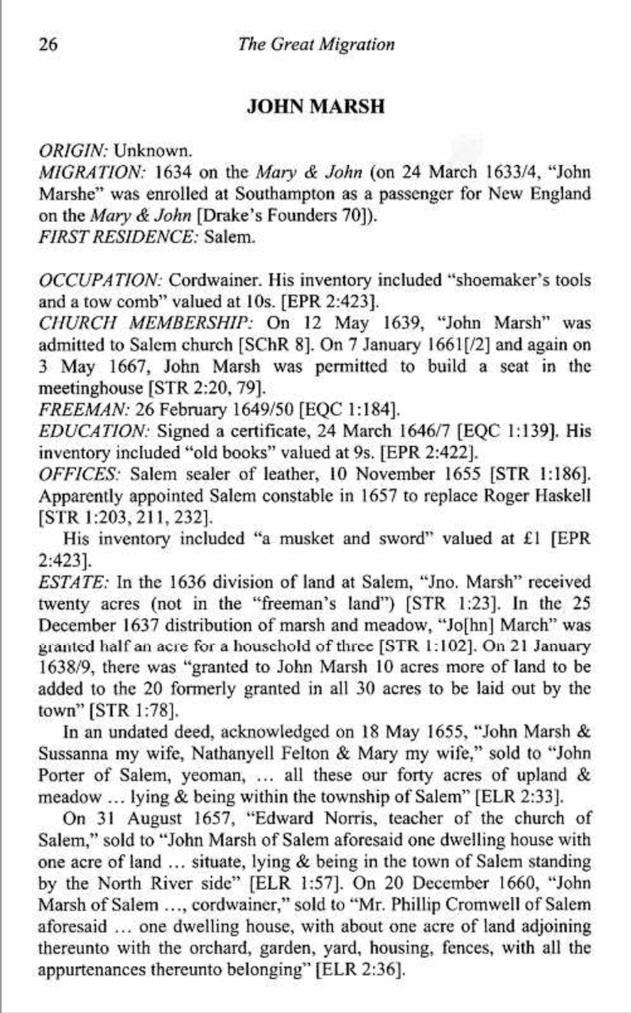 - SALEM FAMILY: The first JOHN MARSH was born about 1611, and sailed to the Colonies on the ship Mary and John in 1634 (as "John Marshe"). He settled in Salem, Massachusetts, where he worked as a cordwainer. On 12 May 1639 he was admitted to the Salem church; In 3 May 1667 he was allowed to build his own seat in the meetinghouse. In 1635 he married SUSANNAH SKELTON (1620-1695) and they had the following children: Zachariah (b. 1637), John (1639-1668), Ruth (b. b. 1641), Elizabeth (1646-1704), Ezekiel (b. 1648), Bethia (b. 1650), Samuel (b. 1652), Susanna (b. 1654), Mary (b. 1656), Jacob (b. 1658), and Benjamin Marsh (b. 1660). He was appointed Salem's "sealer of leather" in 1665 and its constable in 1657. This John died between 28 Mar 1674 (date of will) and 23 Nov 1674 (date of inventory) in Salem, Essex County, Massachusetts.