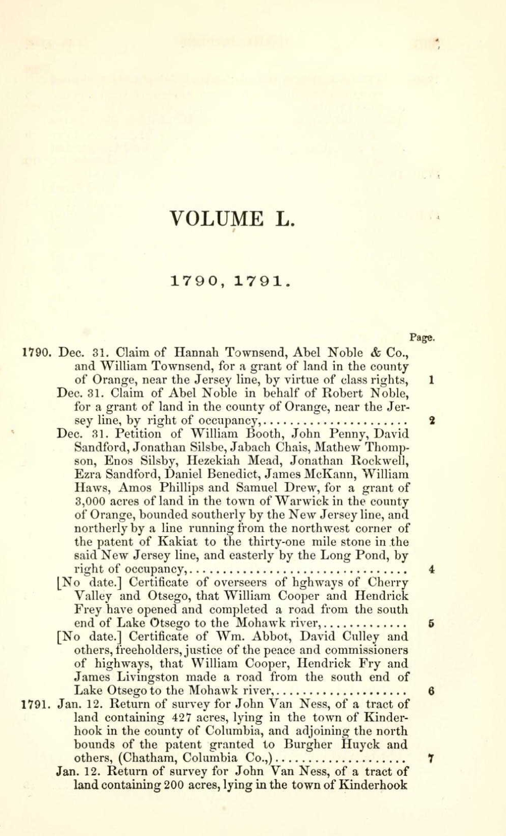 - Calendar of N. Y. Colonial ManuscriptsIndorsed Land Papers; in the Office of the Secretary of State of New York. 1643-1803. Publication date 1864; Publisher Albany : Weed, Parsons & Co. Collection: University of Pittsburgh; Americana. Contributor: University of Pittsburgh Library System; Volume L, page 2, 31 December 1790. (https://archive.org/details/calendarofnycolo00alba/page/834/mode/2up) page 835.