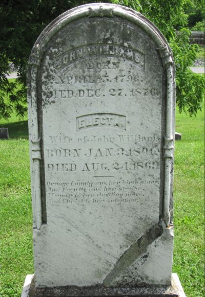 John, born September 15, 1773, married Esther Ketcham, born September 5, 1779 on November 6, 1796. They are buried at Orange County.⁴ Their children were Delebar, Charles, Electa, Augustus, Belinda, John, Alanson, Fannie, Loiza, and Catharine.⁵ Electa was born January 3, 1801 and married John Williams, Jr. on August 25, 1818. He was born April 15, 1796 and died December 27, 1876 at Canoga. She died August 24, 1869. On her headstone at Canoga, Seneca County, New York is written:
