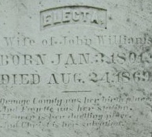 The grave of Electa Ann Hause-Williams. (Click to enlarge.) | | "Orange County was her birthplace, And Fayette was her station, Heaven is her dwelling place, And Christ is her salvation."⁶ |