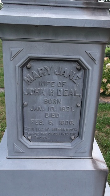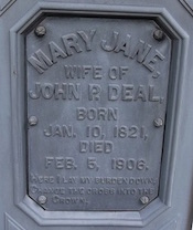 ⁷Mary Jane's birthdate is incorrect, which is strange because she is Alberta's grandmother; Mary Jane Williams was actually born on 10 Jan 1821 in Canoga, Seneca County, New York (according to her gravestone in the Hause Point Cemetery, at left), and died on 5 Feb 1906 in Canoga, Seneca County, New York. She married John Peter Deal 17 Dec 1843 in Seneca County, New York. He was the son of Solomon Deal and Anna Wichtermann, born on 22 Jan 1822 in Seneca County, New York, and died on 24 Jun 1885 in Seneca County. I would submit that the last person whose birthday Alberta Reeder would get wrong in this family history would be her grandmother.
