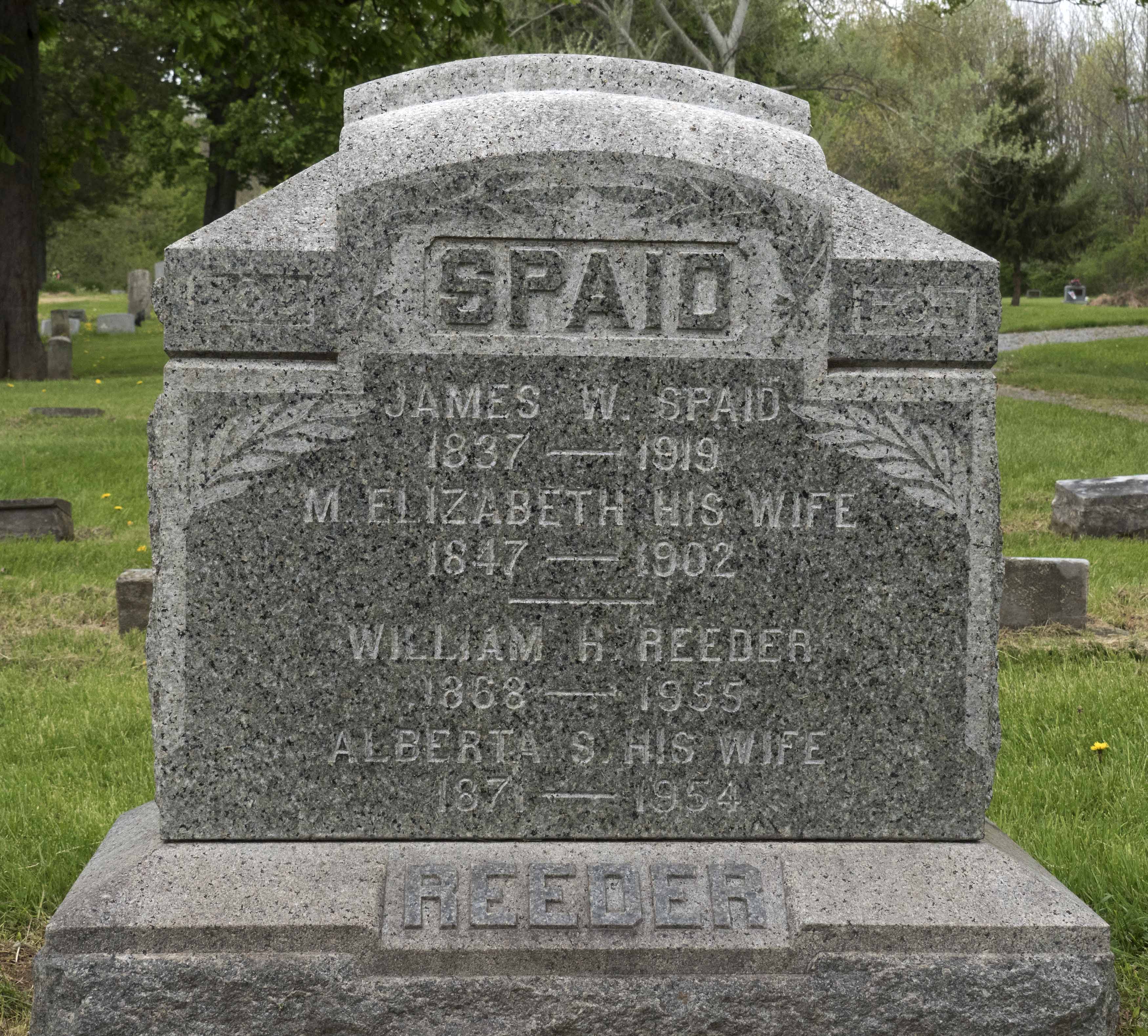 Alberta Spaid Reeder died on 27 Oct 1954 in Geneva, Seneca County, New York. She and William are buried with her parents at Hause Point Cemetery in Seneca County, New York.