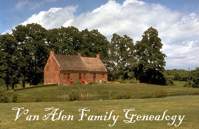 In British Colonial America, the Van Alens were a prominent family from Kinderhook, in Rockland County, and as you will see, they did business with the GARDENIERS and WHEELERS, whose descendant, SARAH WHEELER, would marry Sarah's first son. So if this speculation is correct, there's even a small possibility that Sarah Wheeler was named after her future mother in law! The Van Alen family became quite rich and influential by the time of the 19th Century, living on a large plantation (yes, with slaves, unfortunately). The Van Alens prospered in both business and politics, and even produced a famous 19th Century congressman, John E. Van Alen, who became an intimate friend of George Washington. Unfortunately, the Van Alens of the 18th Century pose the same problems for genealogists that the Haus family does, because the surname constantly changes spellings, and certain family membersespecially womensimply disappear from the record, along with any trace of their descendants (as do members of just about every family in that area, as most of the church and tax records from that time have been lost). Females are the hardest to trace because they just weren't recorded in a lot of family histories. You might luck out and find a female's maiden name listed in a rare surviving church record in the Haverstraw area, but wives weren't even listed in U. S. census' until the mid-1800's. The Van Alens seem to descend from LOURENS VON HALLEN, who some say was from the town of Hallen but settled in Amsterdam (thus, the name, meaning "from Hallen"). The Anglicized version of the name became "Van Alen," as it was spelled by his descendants in Kinderhook. PIETER VON HALLEN, the grandson of Lourens, came to America with his wife and three kids on the ship De Vergulde Bever ("the Gilded Beaver") in 1658. He became a tailor, and also was a justice of the peace in Albany (then called "Beaverwyck"). In 1668, he bought land in Kinderhook. His wife then apparently died, because he remarried in 1669 to MARIA TELLER, daughter of WILHELMUS TELLER, the watchmeester (watchman) of Fort Orange. Pieter died in 1674, leaving (at least) three sons: PIETER JR., WILHELMUS and JOHANNIS. Of those sons, Pieter Jr's family is unknown, but Wilhelmus married MARYTJE VAN PATTEN in 1694, and Johannis married CHRISTINA TEN BROECK in 1701. They would have been starting families right around the time that "Sarah Allen" was born. Only Johannis' family has been chronicled very well, so Sarah could have come from one of the other two brothers, and we would have no way of knowing. Sarah seems to have been a common name in the Van Alen family (at least the traceable family in the 18th and 19th Centuries). A Sarah Van Alen was baptized on January 1st, 1693, according to the records of the Reformed Dutch Church of Albany (Yearbook of the Holland Society of New York, 1903: "Names of the Members of the Church of Jesus Christ at New Albany, at the End of the Year 1683 and Afterward," page 18).