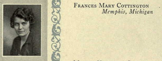 | FRANCES MARY COTTINGTON was born on 18 Oct 1905 in Memphis, Michigan. She graduated with a B.S. from the University of Michigan in 1928 and became a Doctor of Psychiatry, practicing in Hawaii. According to her nephew, Fredrick Cottington, "She did not keep in contact with the family often, and I don't have a lot of information on her." She died in Dec 1985 in Honolulu, Hawaii.See her University of Michigan "Michiganensian Yearbook" photo here. |