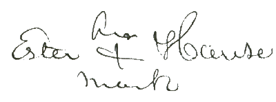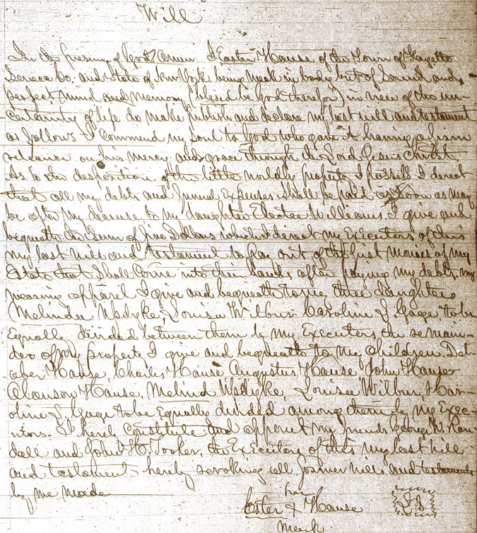 Will of Esther Ketchem Hause In the presence of God Amen. I Ester (sic) Hause of the Town of Fayette Seneca Co., and the State of New York being weak in body, but of sound and perfect mind and memory (blessed be God therefor) in view of the uncertainty of life do make publish and declare my last will and testament as follows. I commend my Soul to God who gave it being a firm believer on his mercy and grace through the Lord Jesus Christ. As to the dispossession of the little worldly property I possess I direct that all my debts and funeral expenses shall be paid as soon as may be after my decease to my daughter Electee Williams I give and bequeath the sum of five dollars which I direct my Executors of this my last will and testament to pay out of the first monies of my Estate that shall come into their hands after paying my debts. My wearing apparel I give and bequeath to my three daughters, Melindee Updyke, Louise Wilburn, Caroline Gage to be equolle (sic) divided between them by my executors. The remainder of my property I give and bequeath to my children Delebar Hause, Charles Hause, Augustus Hause, John Hause, Alanson Hause, Melinda Updyke, Louisee Wilbur, Carolyn S. Gage to be equally divided among them by my executors. I hereby constitute and appoint my friends George W. Randall and John H. Hooker, the executors of this my last Will and Testament, hereby revoking all forever Wills and testaments by me made.   Signed sealed published and declared to be her last will and testament in the presence of us who have Subscribed our services as witnesses in the presence of the other testatrix and each other dated this Second day of April in the year of our Lord One thousand eight hundred and forty seven. George