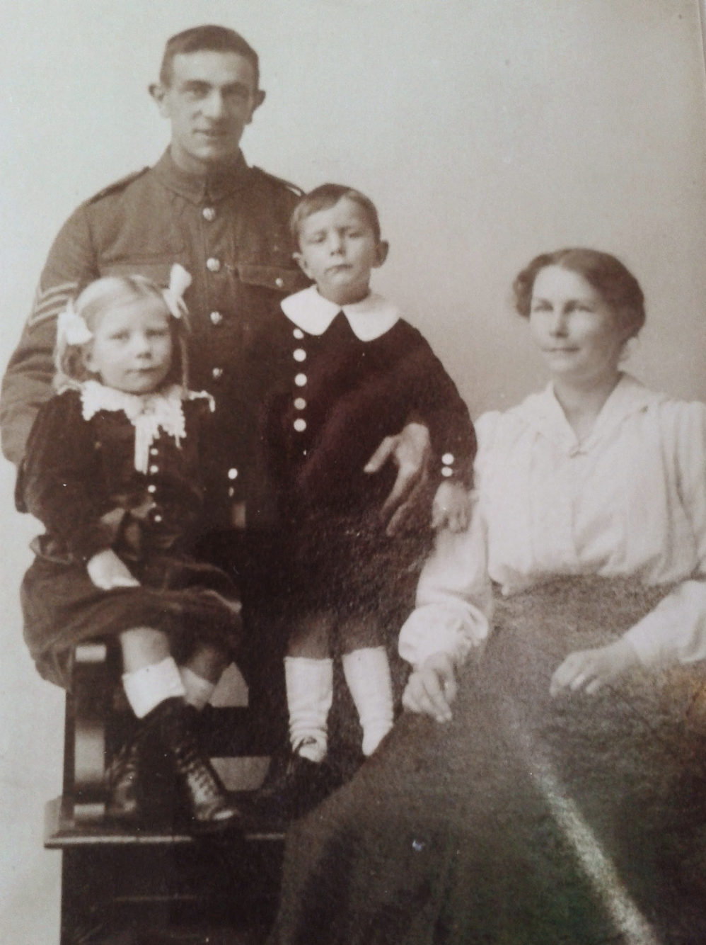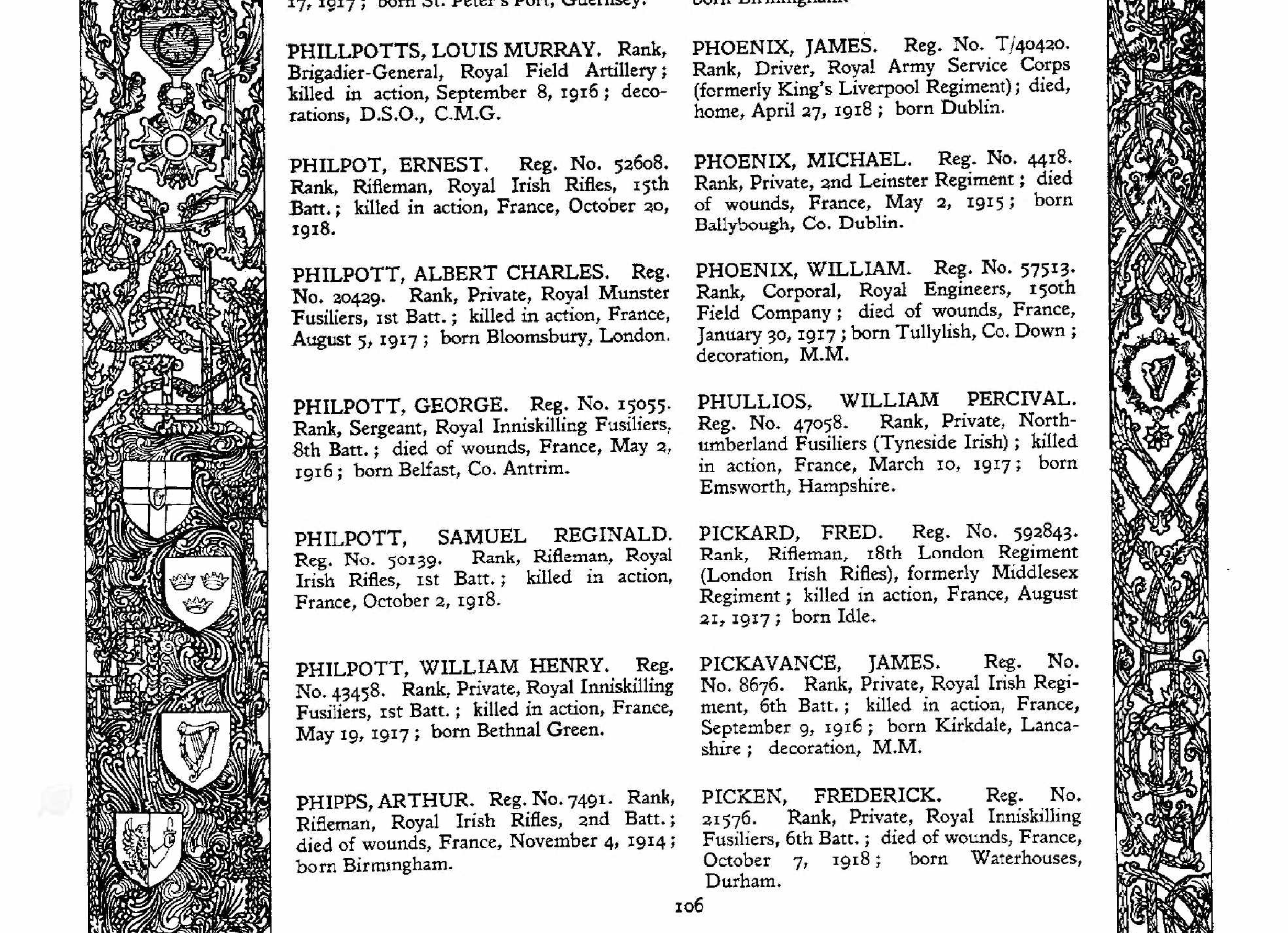 WILLIAM HENRY PHILPOTT was born about 1884 in Bethnal Green, London, England. In late 1905 he married Violet Louisa Delaney (1883-1968) in Fulham, Middlesex, England, and they had William Arthur (1906-1940), Walter Edward (1907-1911), Lillian (Bailey, 1909-2002), and Elsie Philpott (Barber, 1913-1999). William died on 19 May 1917 between France and Flanders in World War I: "PHILPOTT, WILLIAM HENRY. Reg. No. 43458. Rank, Private, Royal Inniskilling Fusiliers, 1st Batt.; killed in action, France, May 19, 1917; born Bethnal Green." (Source: The Committee of the Irish National War Memorial, comp. Ireland's Memorial Records 1914-1918. 8 volumes. Dublin: Maunsel and Roberts, 1923.)