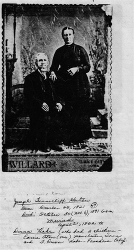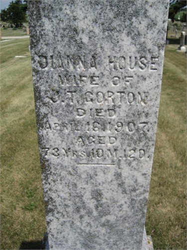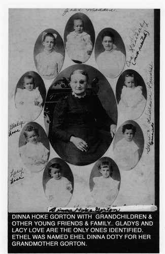 a. Norman married Elizabeth Harter. b. Orville married Adelaide Ackler. c. Charley married Fannie McGreedy. d. Jay S married Ella Houghton Shepard. e. Clayton married Edna Wright. f. Delbert married Dora Cummings. g. Nellie who died young. 11. Mary Ann (b. 1816), daughter of George and Nancy, married William Canfield. 12. Diana was born on 4 Jun 1833 in Columbia, Herkimer, New York and died on 16 Apr 1907 in Lake City, Calhoun, Iowa. She married (1) Daniel Hoke and had the following children: a. Caroline Hoke (b. 1854) b. Orson A Hoke (b. 1856). c. Ellen A Hoke (b. 1858). d. Fenimore Orlando Hoke (1859-1943) Diana then married (2) Joseph Tunecliffe Gorton (1814-1891) in Exeter, Otsego, New York, on 21 Apr 1862 and had the following children: e. Eugene T Gorton (b. 1862). f. Flora Gorton (b. 1865). g. Alice Gorton (1868-1930). h. Emma Gorton (1870-1871). i. Hattie Gorton (1872-1876). j. John Gorton (1875-1876).