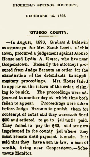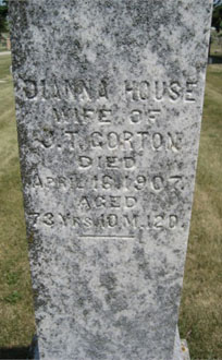 A. Alonzo was born about 1834 in Columbia, Herkimer, New York. He married Emma J Ingram in about 1879 and they had two sons: 1. Ernest C House was born on 25 Jan 1881 in Moravia, Cayuga, New York. He died May 14, 1950 in Cayuga, New York. He married Addie Bush in about 1908. They had a daughter: a. Doris Esther House was born on 19 Aug 1909 in Auburn, Cayuga, New York. She married (1) Wilford E Smith and (2) Harold L Johnson on 10 Oct 1938 in Auburn, Cayuga, New York. She had two children: Jeanne E Smith and Marilyn Smith. She died on 5 Mar 1985 in Auburn, Cayuga, New York. 2. Norman Lee House was born in Jan 1882 in Moravia, Cayuga, New York. He died on 3 Nov 1961. He married Jennie Amidon in about 1908. They had two sons: a. Frank A House (b. 1908). b. Harold Lee House was born about 1915 in Auburn, Cayuga, New York; He died on 8 Nov 1962 in Auburn, Cayuga, New York. He married Pauline E French on 4 May 1936 in Auburn, Cayuga, New York. They had Bonnie House, Michele D House and 2 other children. B. Otis married Lana Miller, had a son Prof. Frank House. Otis married second Miss Underwood. He married a third time, lived at Oneida where he was killed crossing the railroad tracks. C. Maryetta (Mary Etta"), was born in 1838 in Columbia, Herkimer, New York; She died on 19 Jul 1918 in Niles, Cayuga, New York. She married Henry N Belding (b. 1841) and they had a daughter: 1. Mary L Belding was born in 1878 in Moravia, Cayuga, New York. D. Frank ("Cordelia Francenia"; Note: Shaver records her name as 'Frank', and that is how she was remembered by some relatives. 1870 Census has 'Frankie'. Her brother Otis is also recorded in the census as having wife named 'Frank'. She is also 'Frank' in the newspaper account of the settling of her sister Etta's will) was born on 23 Feb 1846 in Columbia, Herkimer, New York. She died on 11 Feb 1932 in Mohawk, New York. She married Julius Benton Slade on January 3, 1867 in Elizabethtown, Columbia, Herkimer, New York. Mohawk Couple Boasts Record in Observing 65th Anniversary, from the Utica Daily Press, Friday, 9 January 1931: "Very few couples in Central New York can ***** the record which was passed today by Mr. and Mrs. Julius Benton Slade of 66 East **** Street, this village, who quietly observed their 65th wedding anniversary. Both are in excellent health and continue to follow the farm routine, even though they reside in the village, namely arising early each morning and retiring early each evening. During the day a host of friends from this village, the town of Columbia, town of Litchfield, and several from Vernon, where Mr. and Mrs. Slade resided several years prior to coming to Mohawk 10 years ago, called or sent letters of congratulation. Mr. Slade was born March 17, 1843, in the town of Columbia, Herkimer County, a son of the late Sewall and Fanny Seckner Slade. When but a boy of 4 years old, he removed to Litchfield with his parents, where he learned farming, which occupation he followed until moving to this village. In politics, Mr. Slade is a Democrat, and it was in 18?6 or there about that he served as school tax collector in the town of Litchfield for two years. When the Civil War broke out, the call to arms made by Predident Abraham Lincoln aroused considerable patriotism in Mr. Slade, and despite the fact that modes of travel were slow, he left the farm at Litchfield and went to Norwich where he enlisted as a private in Company H. Second New York Heavy Artillery. This was in 186?. In 1865 he was honorably discharged in Washington D. C. During his time in the Nation's capital [sic], he had the pleasant experience of **** President Abraham Lincoln on many occasions. Mr. Slade's commanding officer had been Captain Taylor. Among the battles Mr. Slade participated in were 'Wilderness', Spottsylvania, North Anne River, Cold Harbor, and Petersburg. It was at the Cold Harbor fight that Mr. Slade's clothing was bullet riddled, but fortunately no wounds were suffered. Upon returning back to the farm in Litchfield, Mr. Slade was then united in marriage to Francena C. House, on January 1, 1866 by Rev. L. E. Eastwood, minister of the Methodist Church of 'Ellisabethtown,' town of Columbia. 'It was the coldest day I remember,' Mrs. Slade informed a representative of The Press today. Mrs. Slade was born in the town of Columbia, February 23, 18??, a daughter of the late Abram and Mary Bronson House. When she had reached the age of 20, she taught school in Columbia ***** old school located on the site of the present Columbia Church. Later she taught at Illion Gorge School. Mr. and Mrs. Slade have two children, Seward Slade of Mohawk and Mrs. Charles Ebbets of Brooklyn. Mr. Slade has a sister Mrs. ??? House of Herkimer. Mrs. Slade has a brother, Seward Hourse of Herkimer. Among the many remembrances given the happy couple, was a plant, given with best wishes by Justice of Peace and Mrs. Fred N. Graves of this village." Their children: 1. Seward D Slade was born in about February 1867. He married Alice E in 1896, and they had a son (name unknown). He died in 1935. 2. Sabin G Slade was born in 1869 in Syracuse, New York. He married Louise Zinert in about 1894 in Denver, Colorado. He died in 1898 in Denver, Colorado. 3. Carrie May Slade was born in May 1871. She died a teenager on 2 Sep 1888.