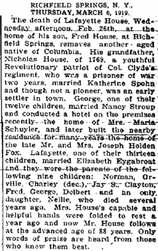 2. Chauncey House (1830-1909). 3. Freeman House (1832-1902). 4. Joseph H House (b. 1832). 5. Elizabeth House (1835-1898). 6. George W House (b. 1837). 7. Delia Ann House (b. 1842). 8. Peter House(dates unknown). 9. Truman House(dates unknown). This record was compiled by Mrs. M. M. Hatch of Richfield Springs several years ago and the people named here are mostly dead, but as their descendants are mostly living in the valley. I believe it will be of interest to them.