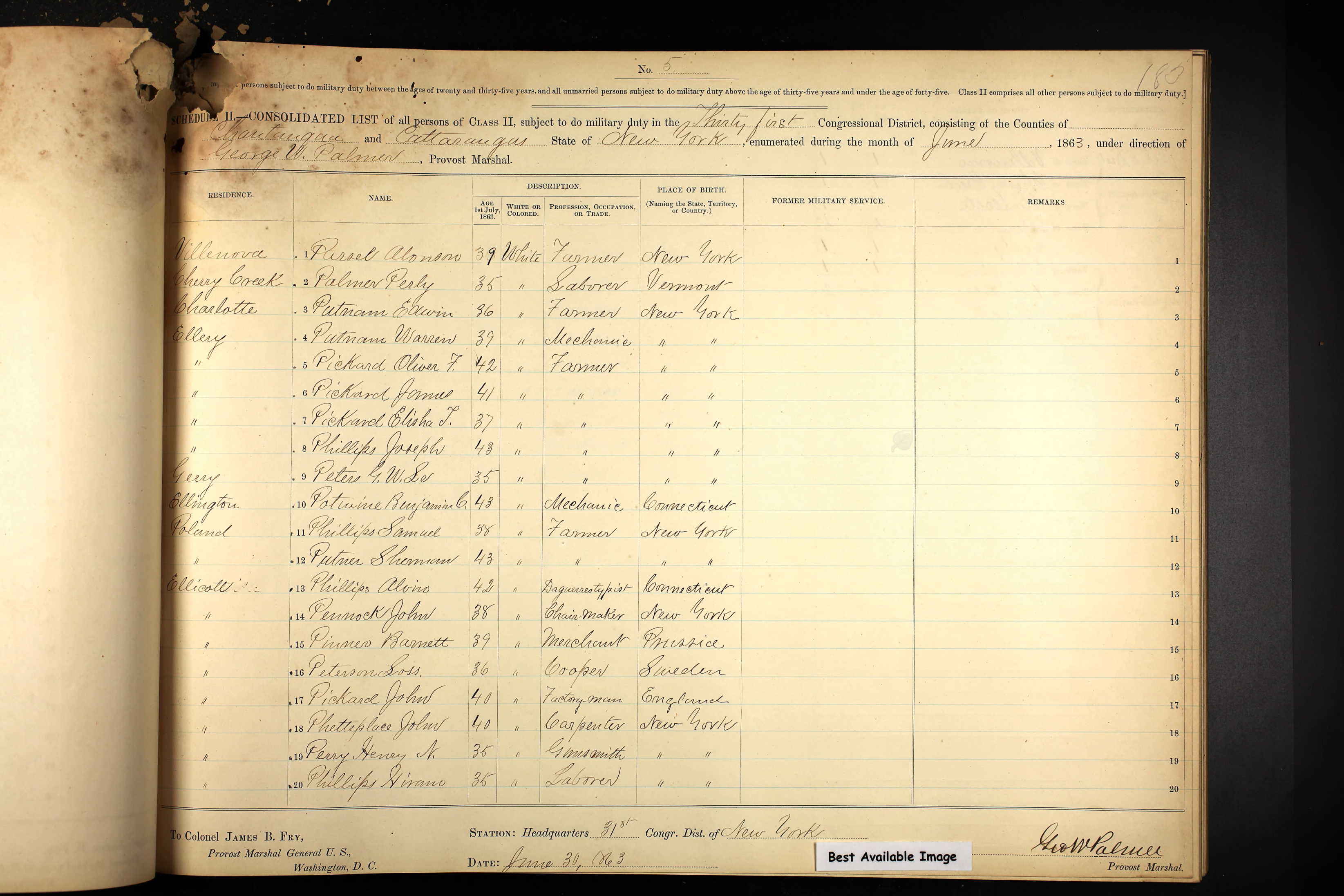 During the Civil War in June of 1863, "Pearly Palmer" from Vermont registered for military duty in Cherry Creek, and then a "Polay Palmer" served as a Private in Unit 12 of the Veteran Reserve Corps 2nd Infantry (United States National Archives: Civil War Service Records, Provo, UT, USA; Box: 636; Extraction 30; Record 2267), which fought from 16 Jul 1863 until 5 Jul 1865.