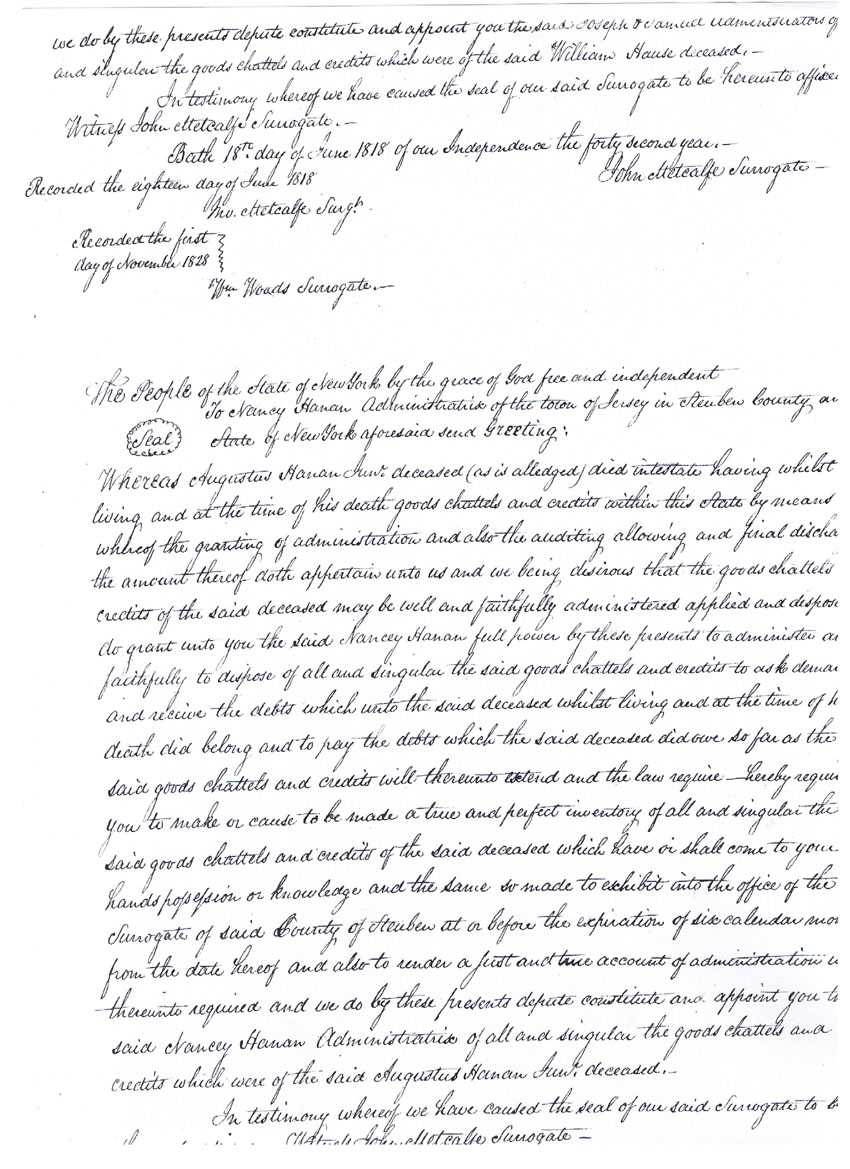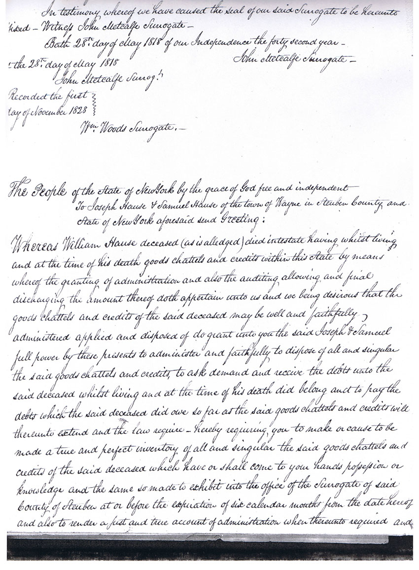 on November 1, 1828, by Surrogate William Woods. | William Hause; Page 392: "The people of the State of New York by the grace of God free and independent To Joseph Hause and Samuel Hause of the town of Wayne in Steuben County and State of New York aforesaid send Greeting: Whereas William Hause deceased (as is alledged) died intestate having whilst living and at the time of his death goods chattels and credits within the State by means whereof the granting of administration and also the auditing, allowing and final discharging the amount thereof doth appertain unto us and we being desirous that the goods chattels and credits of the said deceased may be well and faithfully administered applied and disposed of do grant unto you the said Joseph & Samuel full power by these presents to administer and faithfully dispose of all and singular the said goods chattels and credits, to ask demand and recive (sic) the debts unto the said deceased whilst living and at the time of his death did belong and to pay the debts which the said deceased did owe so far as the said goods chattels and credits will thereunto extend and the law requirehereby requiring